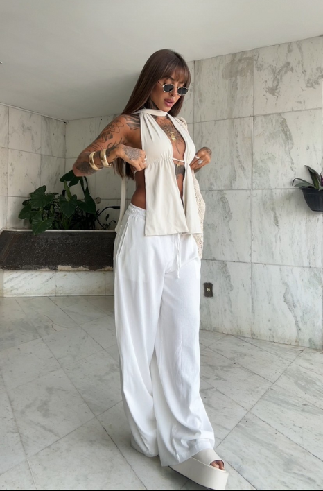 Calça MARÉ- feminina baggy oversize em tecido linho misto