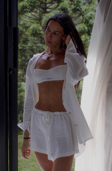 "Apaixonada! É leve, fresca e super estilosa. A modelagem oversize é perfeita, não fica nem muito grande nem muito justa. O linho natural amadurece lindamente. Vale cada centavo!"