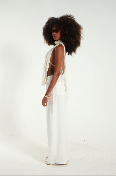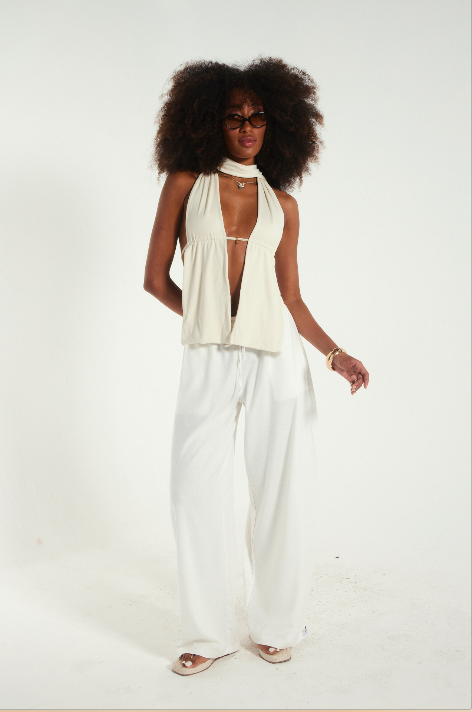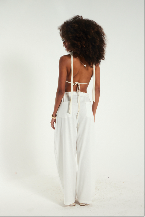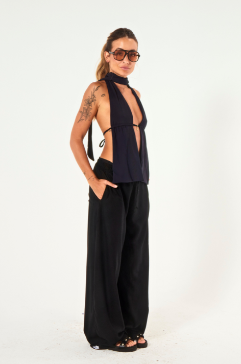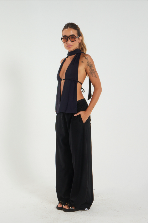 Costas abertas com amarração regulável e pingente semi joia que transforma qualquer look em declaração de estilo.